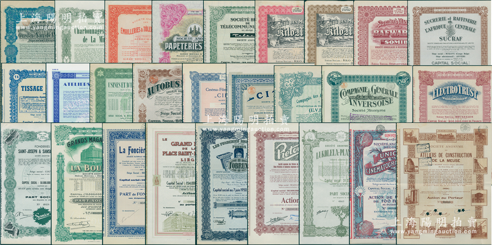 清代1908至1986年比利时王国老股票藏品集一部共143种不同,基本均属大型尺寸,内含银行、信贷、交易所、地产、矿业、航空、工业、制造、啤酒、百货等诸多行业,其中部分在比属刚果殖民地发行,因品种繁多,难以细述;欧洲名家出品,能收集如此丰富者殊为不易,且不乏稀见品种,可适用于展览和馆藏,整体约八至九成新,敬请预览(注:因此项拍品内容太过丰富,故特附有明细清单1份,内中包括英文和中文翻译名称、年份、面额等详尽对照表,使之一目了然!)