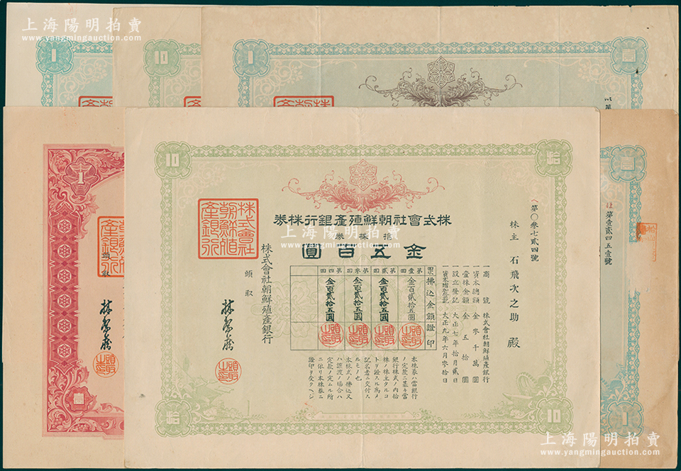 1918至1939年朝鲜殖产银行股票共6张,详分:1918年壹株券、拾株券各1张,1920年壹株券2张、拾株券1张,1939年壹株券1张,均有水印,七至八五成新