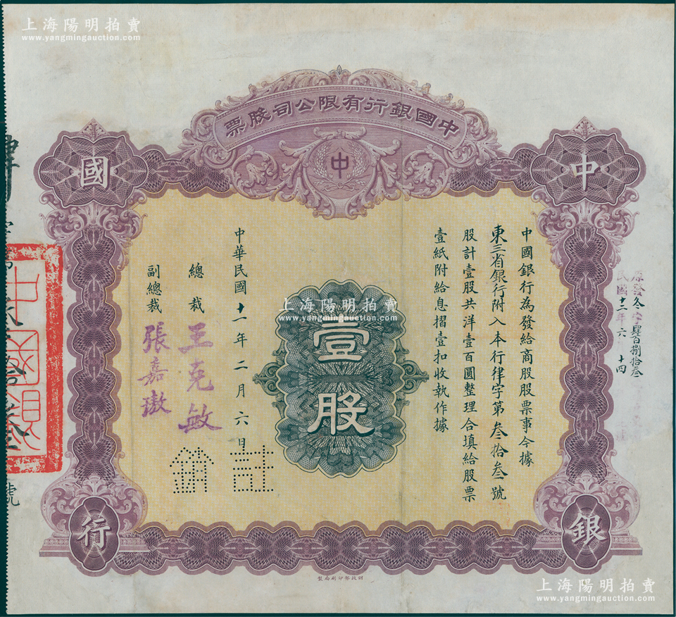 民国十一年(1922年)中国银行有限公司(商股)股票,壹股共洋壹百圆,由总裁王克敏、副总裁张嘉璈签名,其承购股东为“东三省银行”,背印章程摘要,且记录“商股照每年七厘正息”等内容;此种中行商股股票存世少见,有修补,近七成新,敬请预览和重视