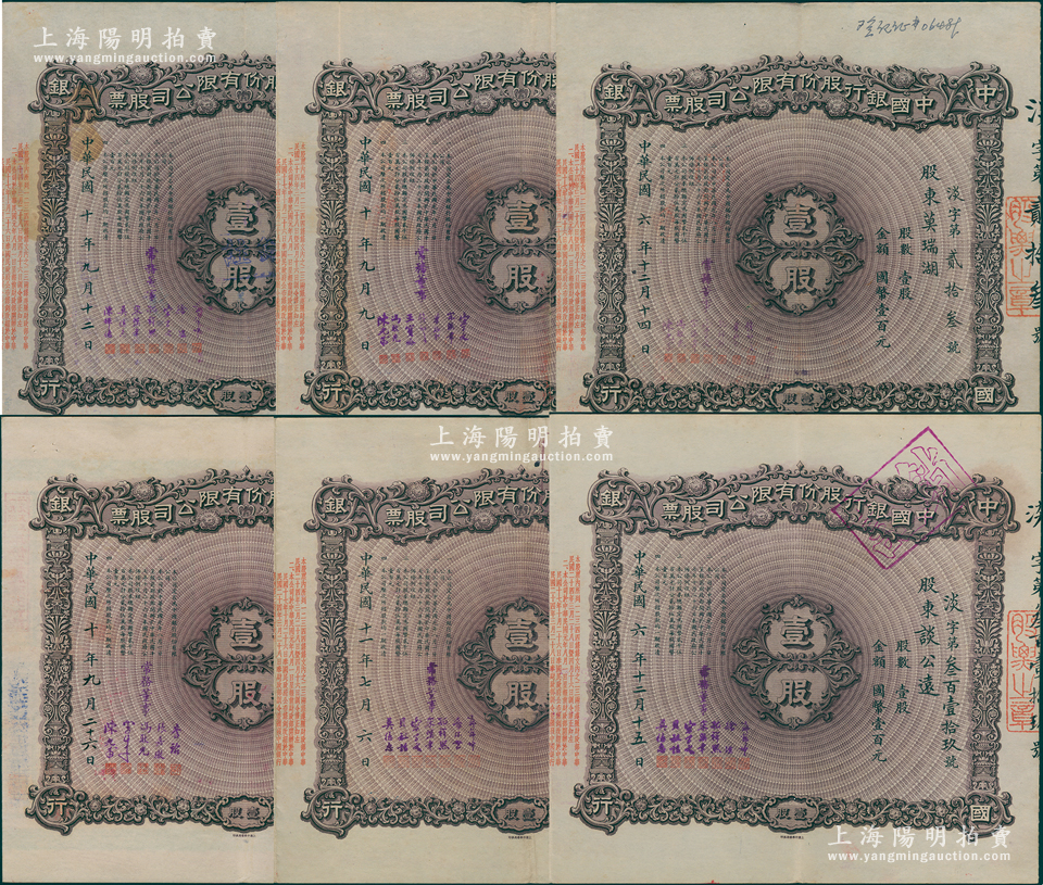 1917至1922年中国银行股份有限公司股票壹股计国币壹百元共6种签名大全套,内含:①李铭、张嘉璈、冯耿光、陈光甫5人签名;②钱新之、叶琢堂、孔祥熙、宋子文、宋汉章、冯耿光、陈光甫7人签名;③宋子文、宋汉章、叶琢堂、钱新之、王宝崘、冯耿光、陈光甫7人签名;④郭锦坤、徐堪、孔祥熙、宋汉章、宋子文、贝祖诒、莫德惠7人签名;⑤郭锦坤、徐堪、宋子文、孔祥熙、宋汉章、莫德惠、陈辉德7人签名;⑥郭锦坤、席德懋、孔祥熙、宋汉章、宋子文、贝祖诒、莫德惠7人签名;成套者少见,八至八五成新