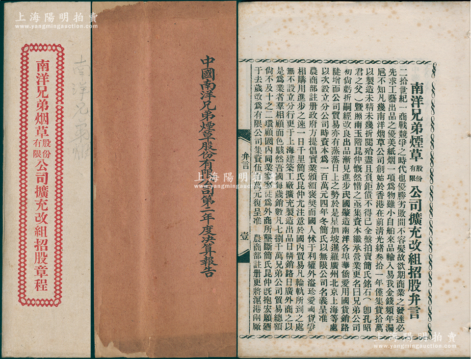 民国八年(1919年)《南洋兄弟烟草股份有限公司扩充改组招股章程》1册,内中言及该公司“发轫于1905年,至1915年在北洋政府注册公司”等缘由,且详列附股须知、新旧公司契约、公司章程46条、各地招股处及代收股款处、赞成人及发起人姓名及地址等,内容极为详尽,乃研究该公司早期史之珍贵史料;另附1921年该公司《第二年度决算报告》1册,保存较佳,敬请预览和重视