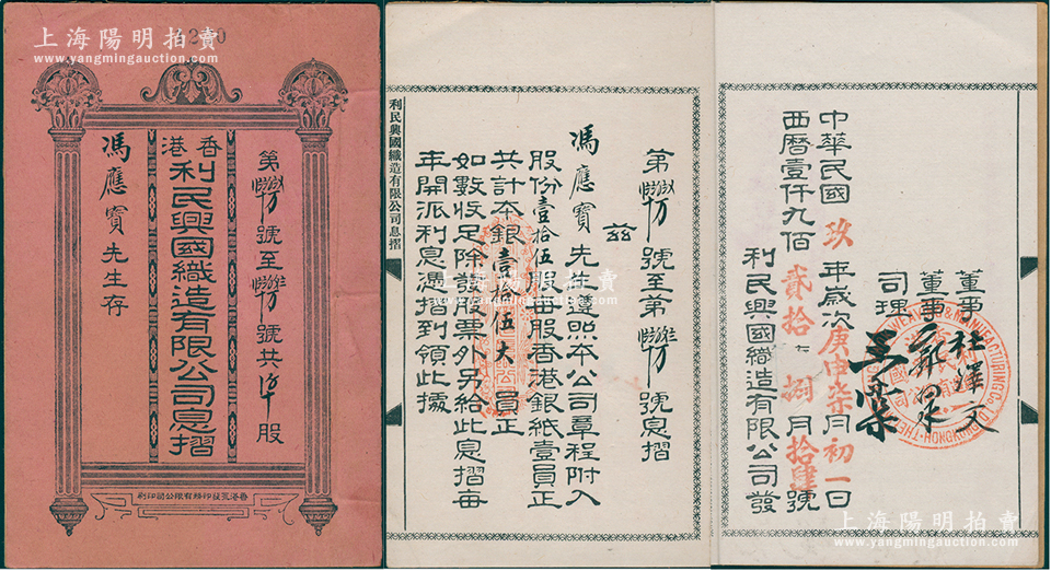 民国玖年(1920年)《香港利民兴国织造有限公司息摺》1册,由冯应宝氏入股壹拾伍股计银壹拾伍大员,其付息记录至癸酉年(1933年),上有董事郭泉(著名华侨实业家,永安公司创始人)、司理王棠(同盟会元老)等亲笔签名;少见,八成新