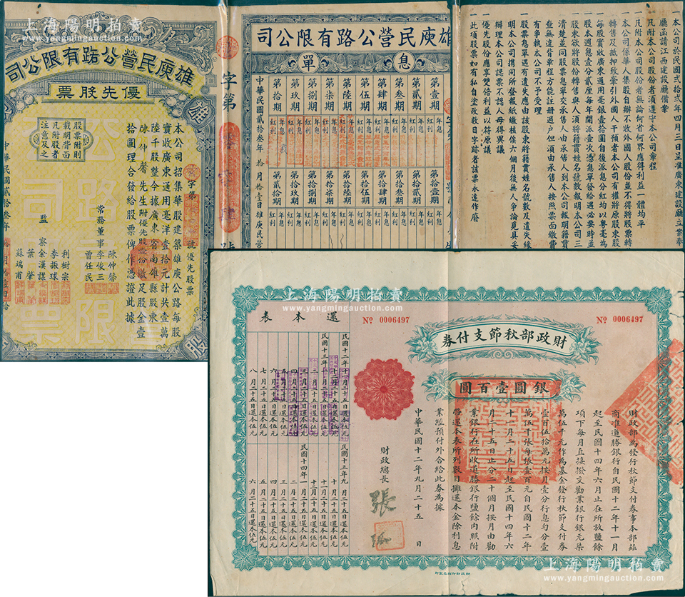 民国股票债券2种,详分:1934年雄瘐民营公路有限公司优先股票,优先股壹股计毫洋壹拾圆,背印章程,附带息单,此品种乃首度公诸于阳明,唯惜有缺损及塑封;1923年财政部秋节支付券银圆壹百圆;源于纸币藏家出品,六至七成新,敬请预览
