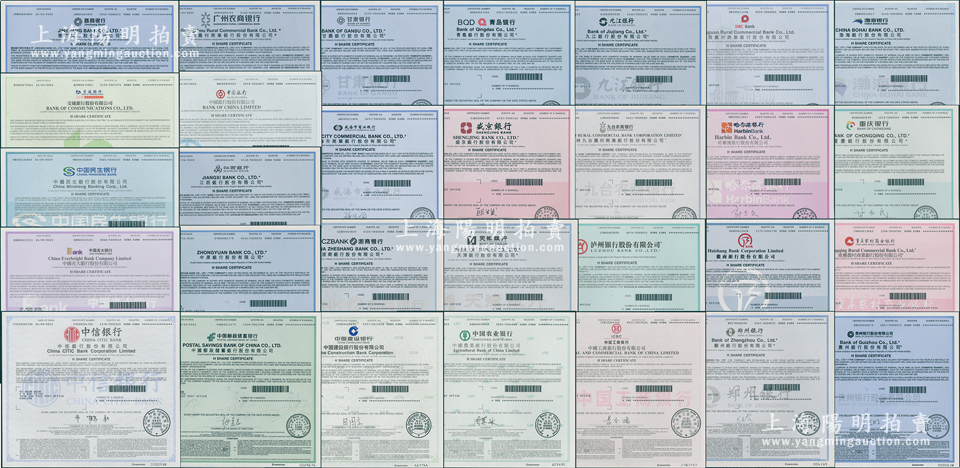 2020至2023年香港上市之中国各大商业银行股票共30种,详分:中国银行、中国工商银行、交通银行、中国农业银行、中国建设银行、中国邮政储蓄银行、中国民生银行、中国光大银行、中信银行、渤海银行、重庆银行、重庆农村商业银行、东莞农商银行、哈尔滨银行、徽商银行、九江银行、青岛银行、甘肃银行、广州农商银行、贵州银行、江西银行、晋商银行、九台农商银行、泸州银行、盛京银行、天津银行、威海市商业银行、浙商银行、郑州银行、中原银行,面额均为1股,全部有水印,九八成新