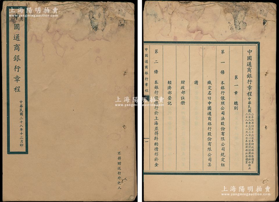 民国二十八年(1939年)《中国通商银行章程》1册,内中刊列总则、资本、业务、组织、监察人会、行务总会、股东会、决算、附则等详细章程65条,极富史料价值,罕见且保存尚佳,敬请预览