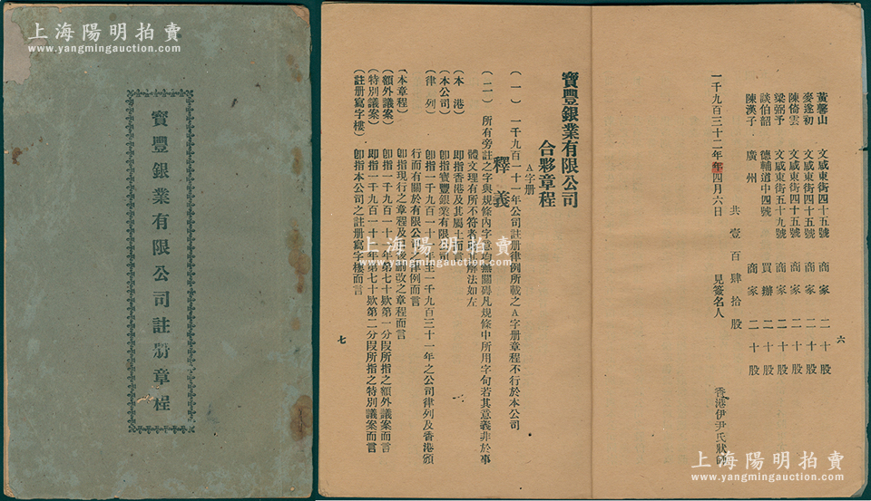 1932年香港《宝丰银业有限公司注册章程》1册,内中刊列合夥节略36条及7位股东芳名、地址及所占股数(包括广州电影院大王陈汉子等),并有合夥章程191条,涉及股份、催收股银、股份充公、转股与过股、董事局等方方面面,内容异常详尽;罕见且保存较佳,敬请预览