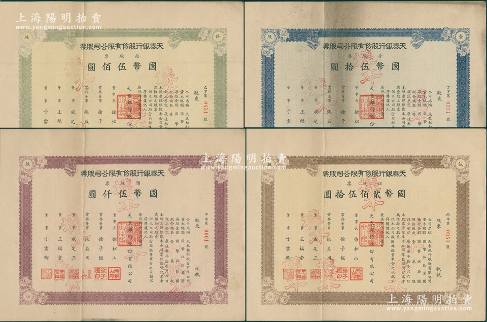 1937年(哈尔滨)天泰银行股份有限公司股票样本共4种全套,内含:壹股票国币伍拾圆、伍股票国币贰佰伍拾圆、拾股票国币伍佰圆、佰股票国币伍仟圆各1张,属哈尔滨之商业银行,其中佰股票号码为“甲字第0001号”,罕见,八至九成新