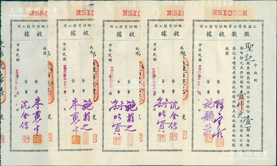 民国卅二年(1943年)上海永丰企业股份有限公司股款收据共5枚不同一套,内含壹百股计国币壹仟元4种、伍百股计国币伍千元1种,其票上董事签名各不相同,分别有施省之、施韵若、舒昭贤、沈金信、陈宝古、朱黄生等,八至九成新