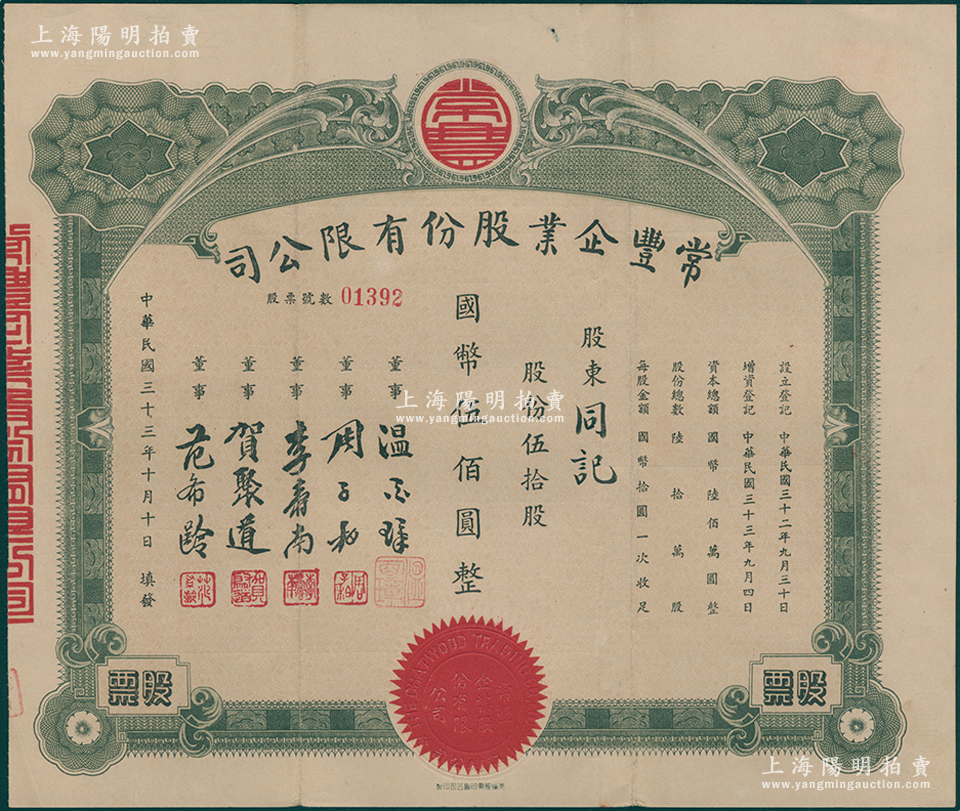 民国三十三年(1944年)常丰企业股份有限公司股票,伍拾股计国币伍佰圆,属上海老股票之新品种,少见且属首度公诸于阳明,八成新