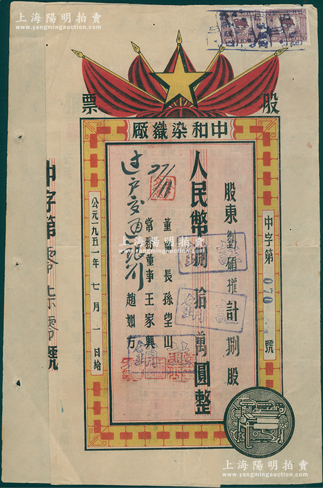 1951年(四川宜宾)中和染织厂股票,捌股计人民币捌拾万圆,上印五星、红旗及机器图颇为别致,票上董事长孙望山乃五粮液创始人,背面上端浮贴存根,少见,八成新