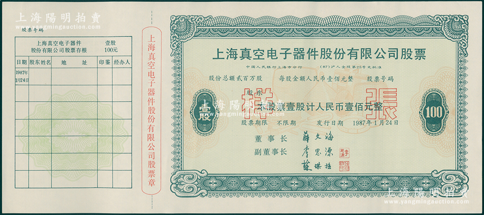 1987年上海真空电子器件股份有限公司股票“样张”,壹股计人民币壹佰元,附带有存根,属改革开放后上海“老八股”之一;此“样张”存世罕见,且属首度公诸于阳明,九五成新