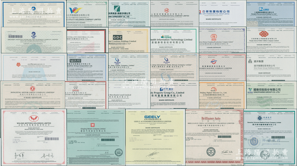 2020至2023年香港上市之中国各大著名企业股票共29种,详分:阿里健康、保利置业集团、招商局置地、北京汽车、东风汽车、华晨汽车、吉利汽车、庆铃汽车、五菱汽车、国药控股、环球医疗、上海医药集团、石药集团、新华制药、沪杭甬高速公路、沈阳公用、中生北控、津燃公用、辉南长龙生化药业、环球数码、顺丰同城、海王英特龙生物技术、远洋集团、广深铁路、上海锦江国际酒店(集团)、上海锦江资本、红星美凯龙家居集团、香港中旅国际投资、北京迪信通商贸公司等,面额均为1股,全部有水印,九八成新
