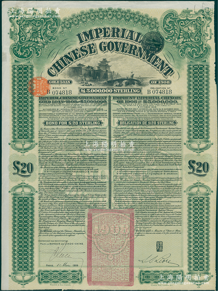 1909年大清帝国政府对外发行京汉铁路债券20英镑,上印英国著名版画家托马斯·阿洛姆手绘的北京西直门图景,由东方汇理银行(Banque de L'Indo-Chine)代理发行,驻法公使刘式训签名;海外回流品,八五成新