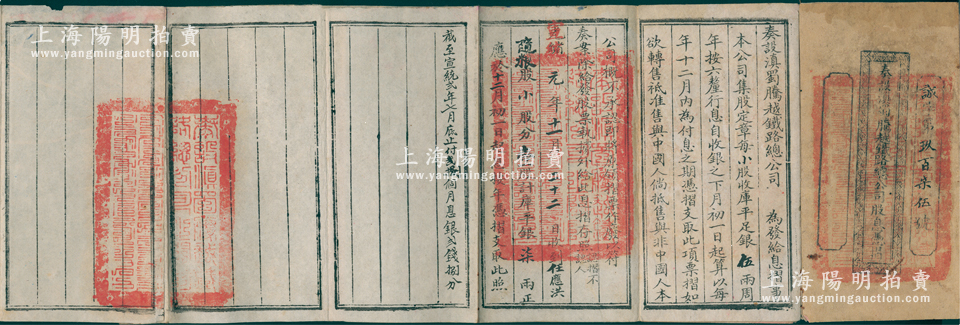 光绪改宣统元年(1909年)《奏设滇蜀腾越铁路总公司股息凭摺》1册,随粮股小股分壹股计库平银柒两,付息记录至民国九年,罕见且属首度公诸于阳明,七五成新