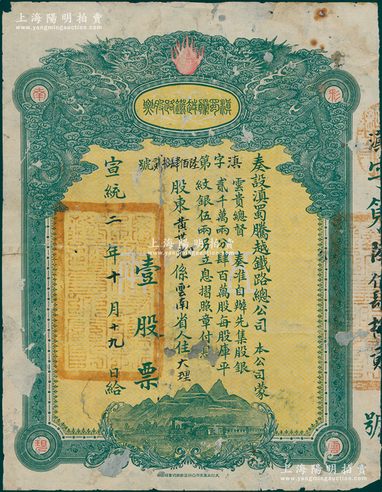 宣统二年(1910年)滇蜀腾越铁路股票,壹股计库平纹银伍两,双龙图内有水印,且盖有官印,背有贴补,近七成新