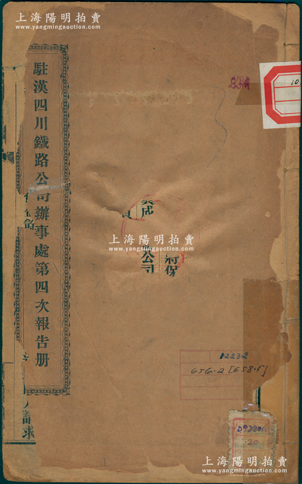 民国九年(1920年)《驻汉四川铁路公司办事处第四次报告册》1册,事为造报1917至1919年收支各款及历年账目总册报告书,内中详细记录支付股息等情,对研究川汉铁路股票不失为重要之原始资料,保存尚可,封皮破损,内文完好,敬请预览