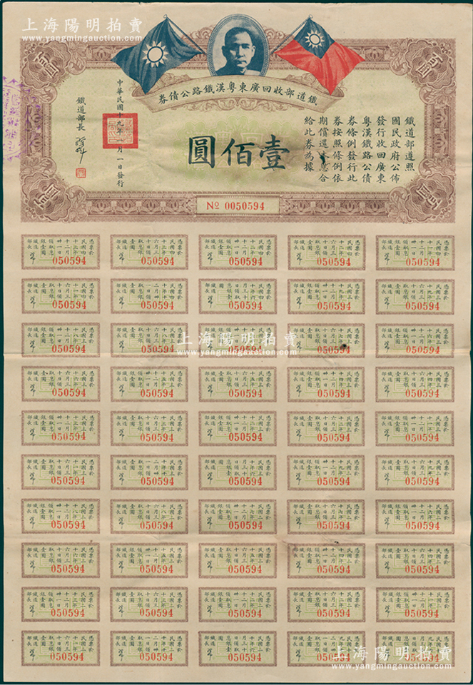 民国十九年(1930年)铁道部收回广东粤汉铁路公债券壹佰圆,附带完整息票者少见,海外回流品,近八成新