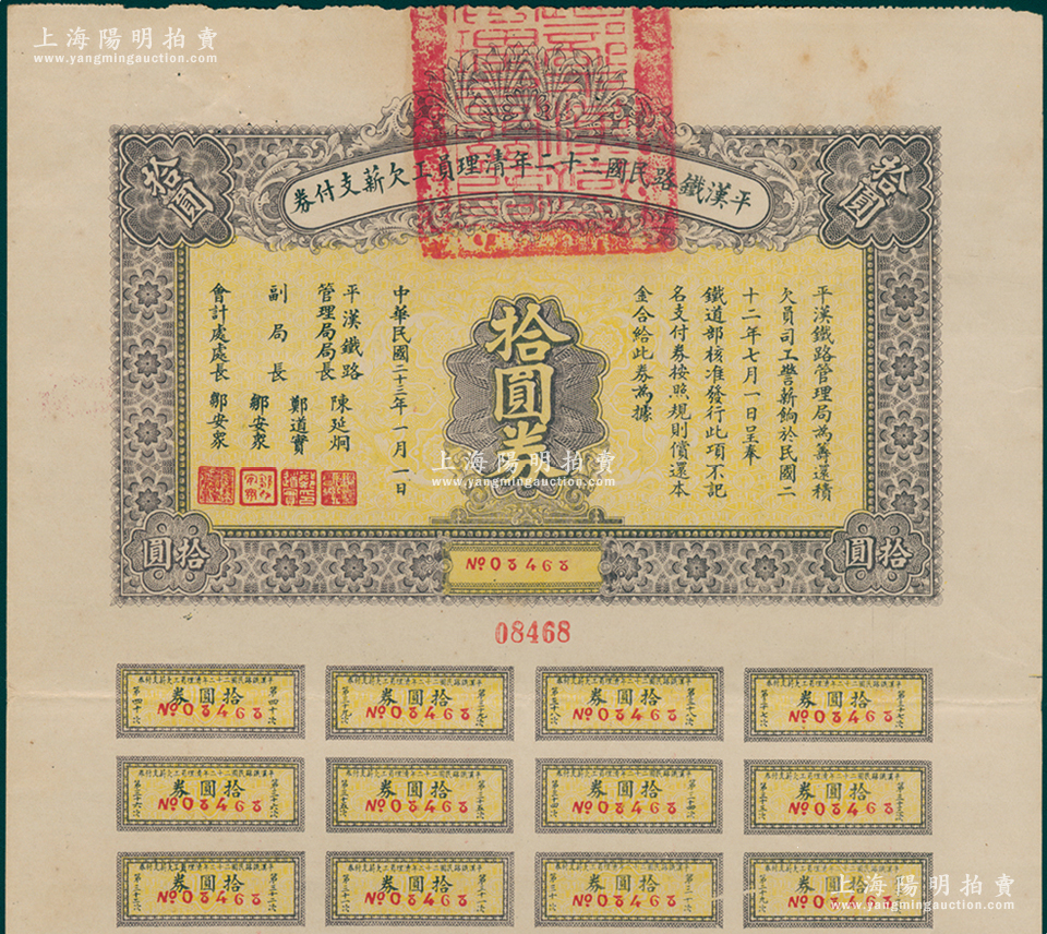 民国二十三年(1934年)平汉铁路民国二十二年清理员工欠薪支付券拾圆券,附带有息票,八成新