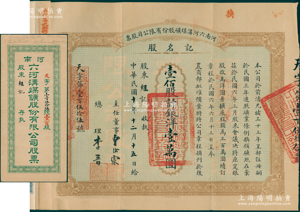 民国十年(1921年)河南六河沟煤矿股份有限公司股票,记名股壹百股计银洋壹万圆,由主任董事曹汝霖(北洋政要、新交通系首领,曾任交通总长、财政总长、交通银行总理等职)、总理李晋(即李祖绅,著名实业家,镇海小港李家子弟)亲笔签名,且附带原封套;中国老股票之罕见品,八五成新
