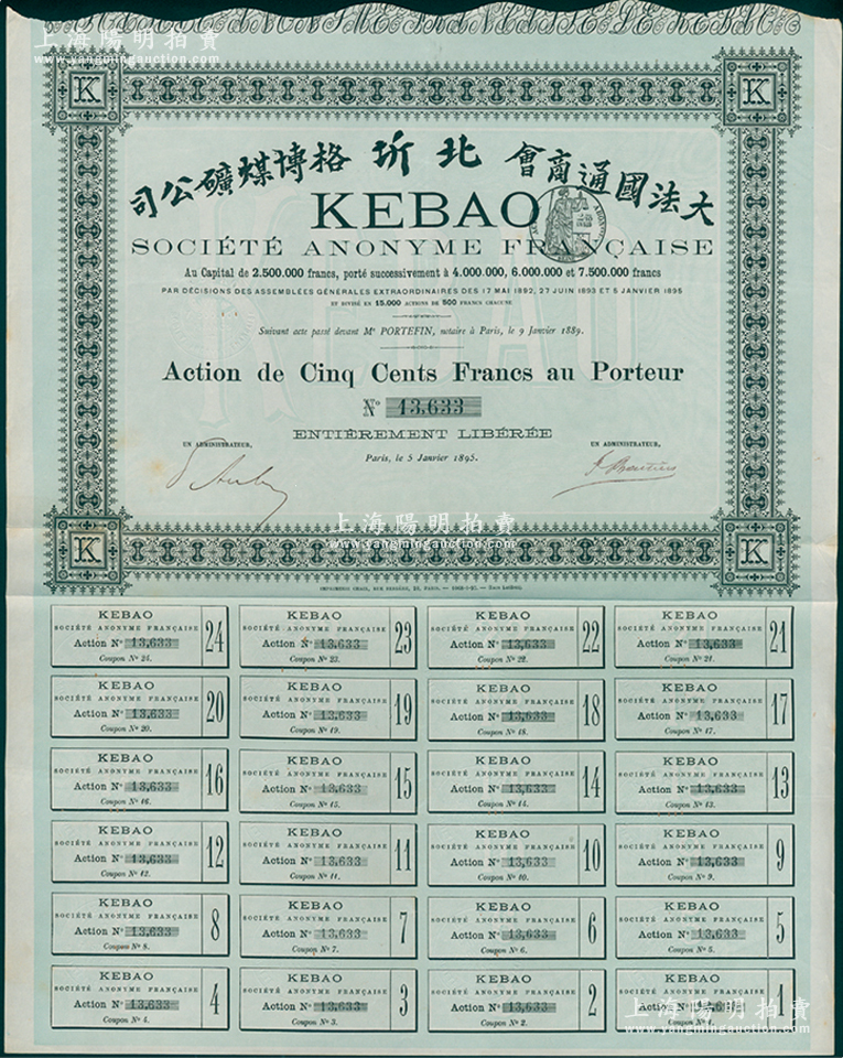 清代1895年(大法国通商会)北圻格博煤矿公司股票,绿色普通股500法郎,附带有完整息票,少见,八成新