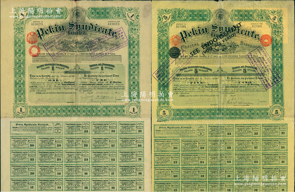 清代至民国时期北京福公司(著名英资公司,专门在中国经营铁路和矿产事业)股票2种,详分:1914年1股计1英镑、1911年5股计5镑,均附带息票;此种股票专为开发山西煤铁矿产而特别发行,票上印有“Shansi”(山西)地名,八成新
