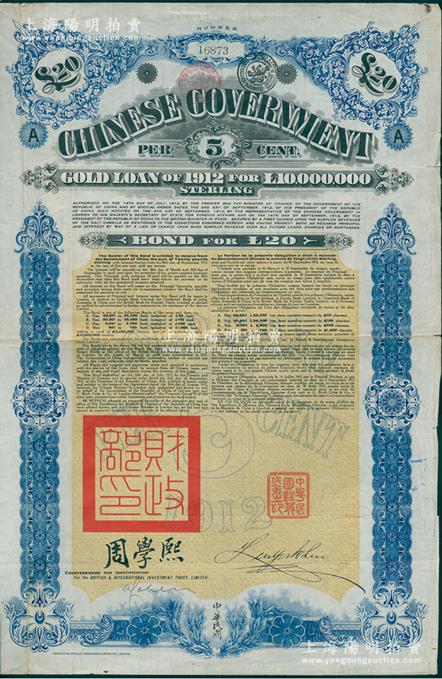 1912年中华民国政府对外发行五厘金镑债券(即克里斯浦借款)20镑,盖有“中华民国驻英代办之印”、驻英公使刘玉麟和北洋政府财政总长周学熙签名,附带有息票,有水印;海外回流品,近八成新