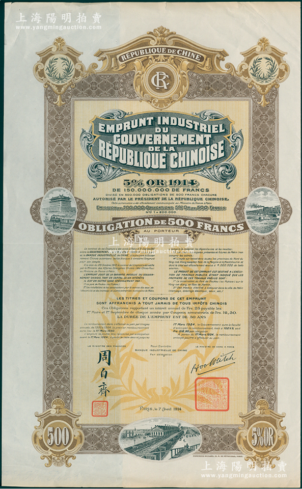 1914年中华民国政府对外发行五厘工业贷款债券500法郎库存备份票(无号码版),用于债券持有人丢失后补换,由中法实业银行(Banque Industrielle de Chine)代理发行,上印有财政总长周自齐签名,附带息票;海外回流品,少见,近九成新