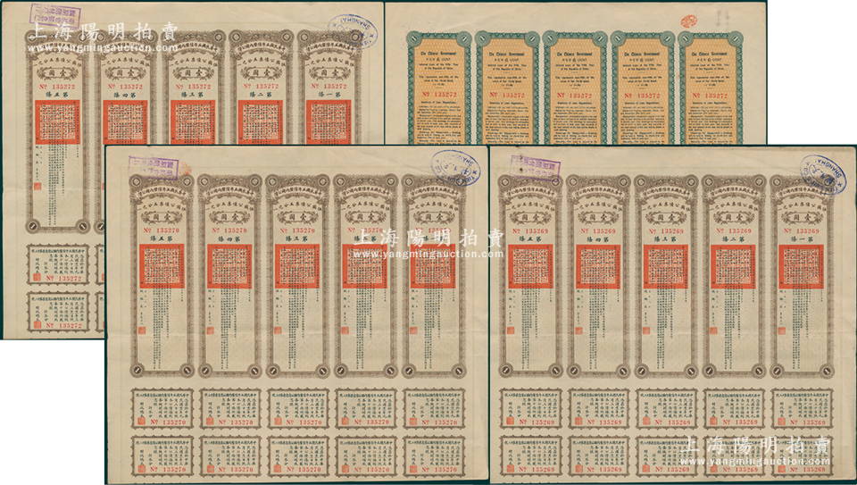 民国八年(1919年)中华民国五年陆厘内国公债伍圆公债票(即壹圆五联张)共3张,由财政总长李思浩署名,附带有息票,少见,八成新