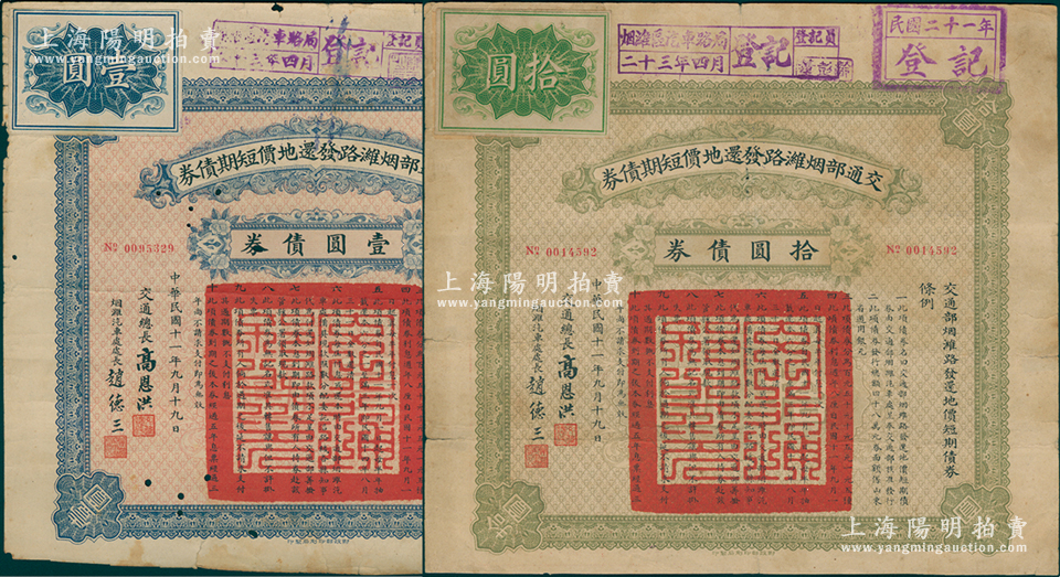 民国十一年(1922年)交通部烟潍路发还地价短期债券壹圆、拾圆共2张不同,由交通总长高恩洪、烟潍汽车处处长赵德三署名,七至七五成新