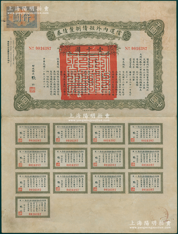 民国十一年(1922年)偿还内外短债捌厘债券壹千圆,由财政总长张弧签署,附带完整息票,属北洋政府最著名之“九六公债”,以盐余为担保;此乃“九六公债”第二版之最大面额,源于名家旧藏,少见且属首度公诸于阳明,八成新