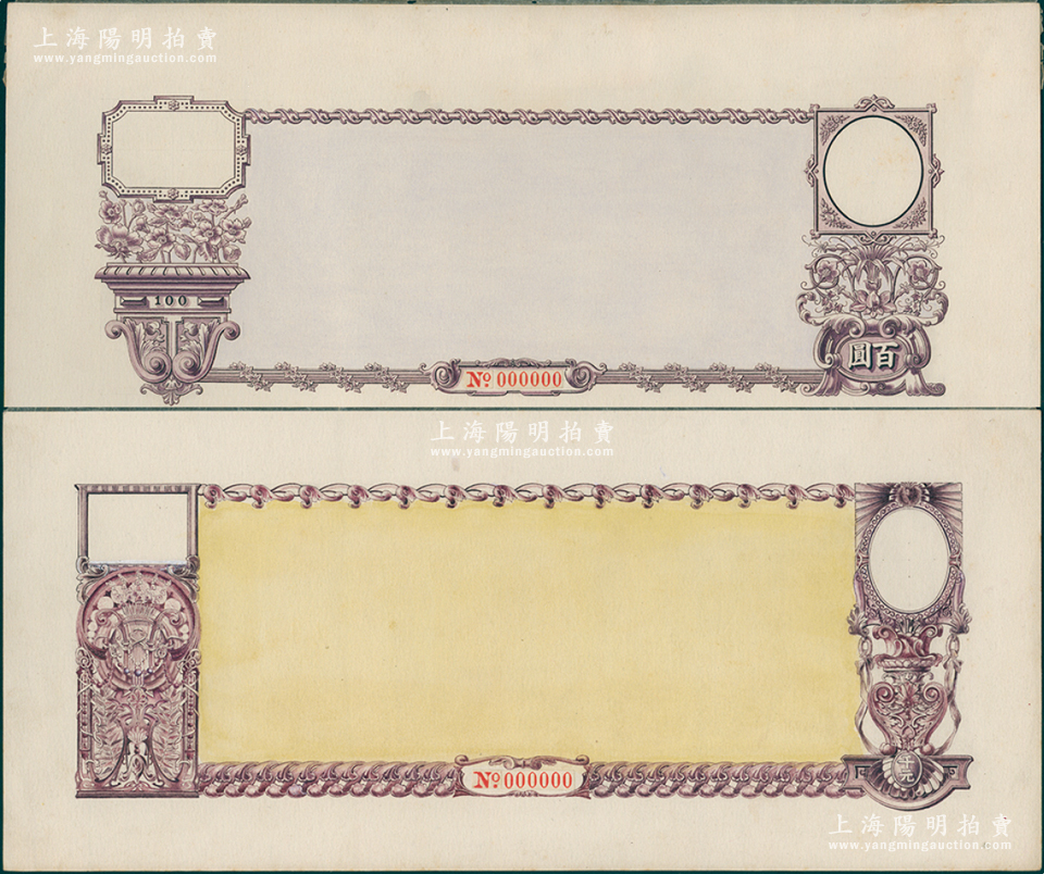 民国时期公债百圆、千元手绘设计稿共2张不同,形制美观,花纹细腻,保存完好,敬请预览