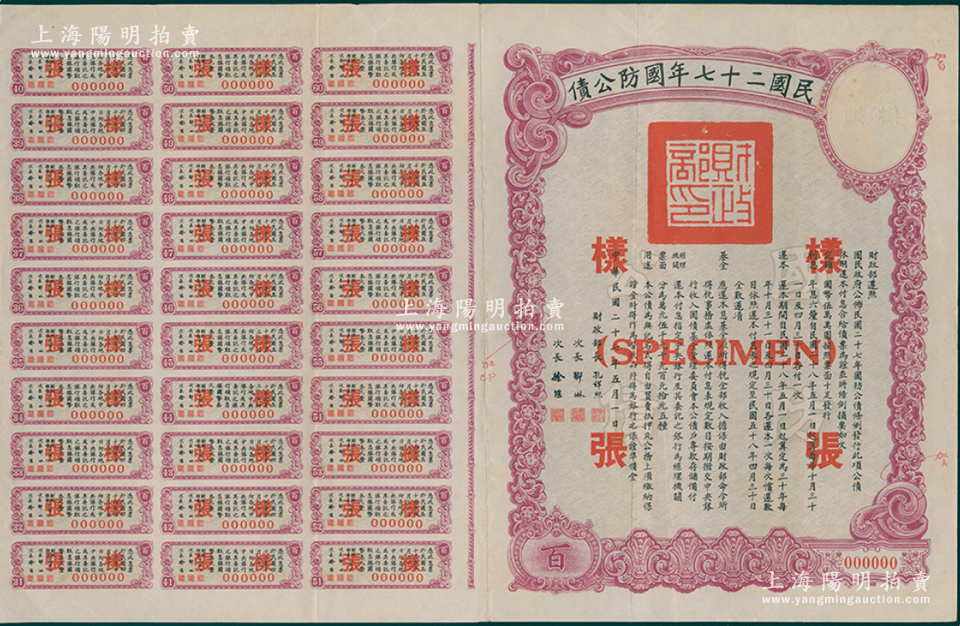 民国二十七年国防公债百圆样张,票上标注有暗记之所在,附带完整息票;源于名家旧藏,罕见,八五成新