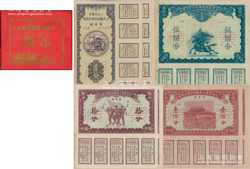 1950年《人民胜利折实公债券样本》1册,内含第壹期伍佰分1枚、壹佰分2枚、拾分2枚、壹分2枚共4种7枚票样大全套;此种新中国第一套债券样本存世极为珍罕,诚可遇而不可求也,封皮略旧,内中实物约九成新,敬请预览和珍视(注:此种样本册,阳明之前仅在2018年4月春拍时拍过1册,但内中仅有4枚票样者,其成交价高达207,000元!)