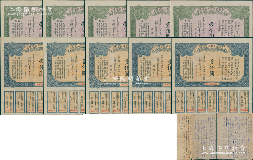 民国十八年(1929年)三北鸿安两公司航业债券壹佰圆、壹仟圆各5张连号,合计共有10张,由董事长虞洽卿、经理虞顺恩署名发行;此债券由三北轮埠公司、鸿安商轮公司共同发行,属近代著名民族企业之公司债;源于范氏家族之遗存,罕见且属首度公诸于阳明,八成新(另附1950年债券持有人范氏致上海市人民法院“要求偿还此10张债券”之诉请底稿2页、照片2张)