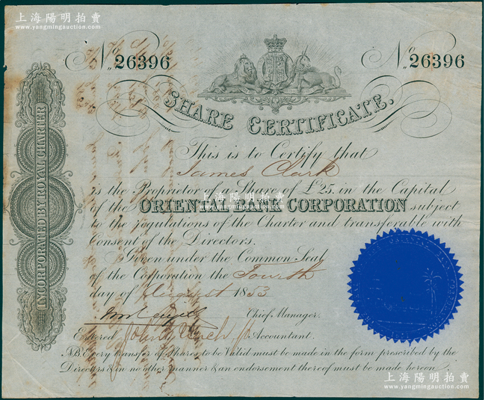 清代1853年丽如银行(中国第一家外商银行)股票25镑,薄纸版,票上有蓝色火漆印,背面付息记录至1866年;海外藏家出品,少见,八成新