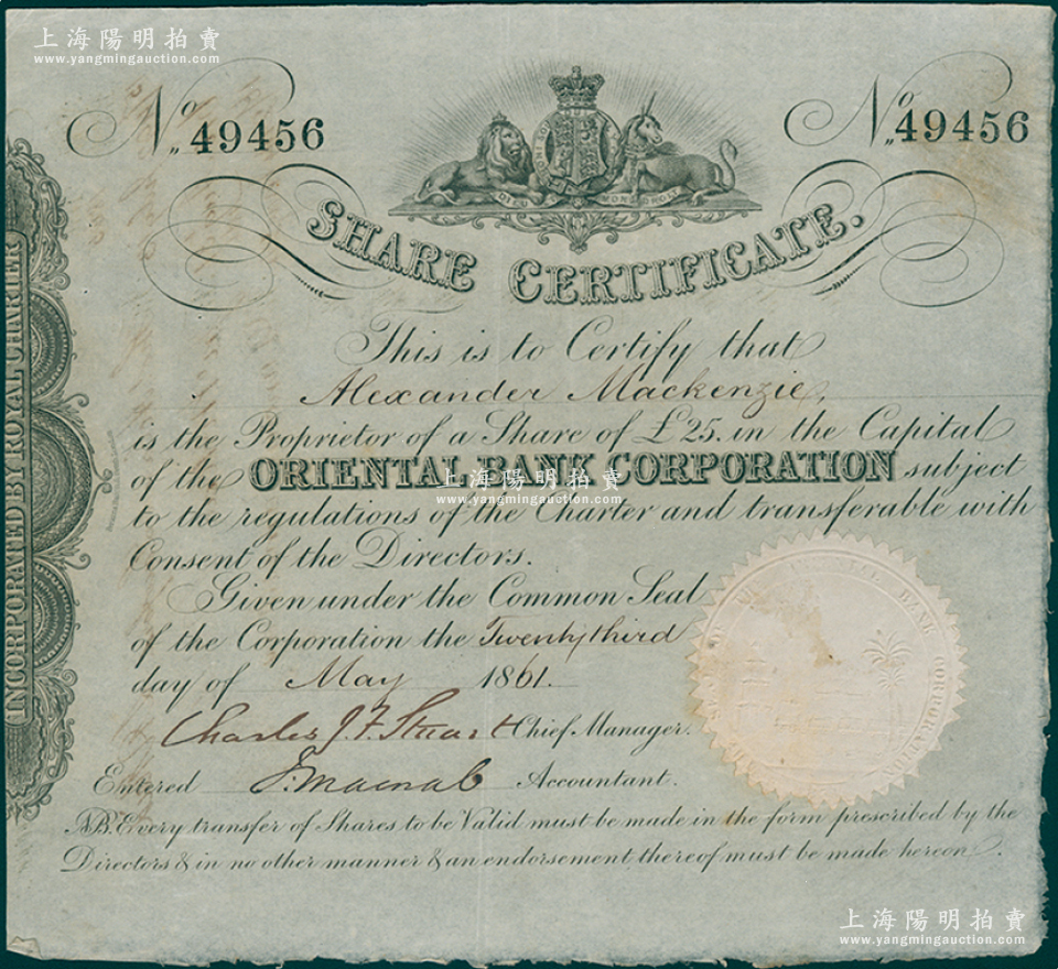 清代1861年丽如银行(中国第一家外商银行)股票25镑,票上贴有白色钢印纸,背面付息记录至1866年;海外藏家出品,少见,八成新