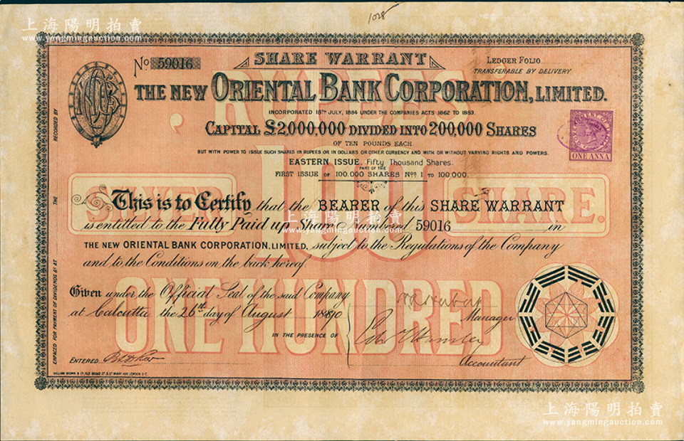 1890年新丽如银行(1884年丽如银行倒闭后再行改组成立)股票,棕色100股计1000镑,背面付息状况至1891年,内有水印;海外藏家出品,八五成新