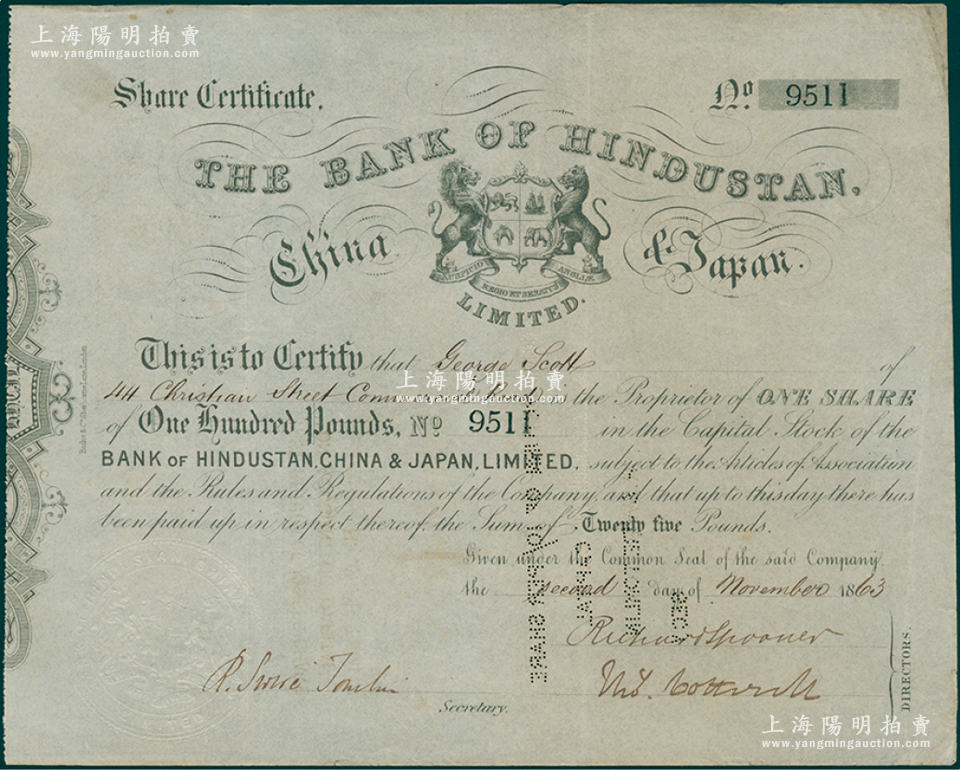 1863年利生银行(中国最早期外商银行之一,香港称“慳度士丹中国日本汇理银行”)股票,第一版白纸质,面额1股计100英镑,票上有精致钢印,罕见,八成新