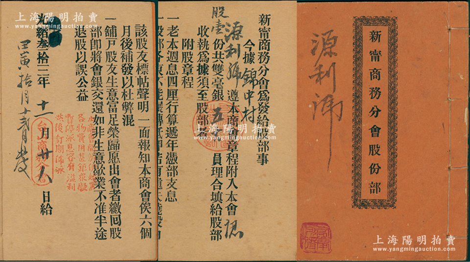光绪叁拾三年(1907年)《新宁商务分会股份部》1册,由源利号认股壹份共双毫银五大员,且内中印有附股章程等,少见,八成新