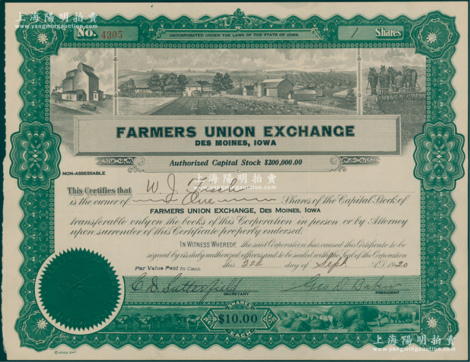 1920年爱荷华州得梅因农民联盟交易所股票,1股计10美元,上印乡村房屋、农场和马犁地图等,形制美观;爱荷华州属美国第二农业州,1920年该州首府得梅因成立农民联盟交易所,旨在通过集体力量提高议价能力;海外藏家出品,罕见,八五成新
