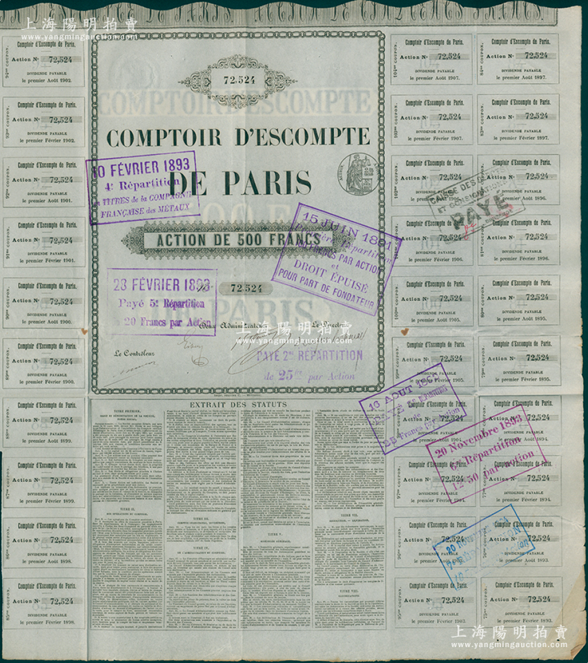 1888年法兰西银行(最早进入中国的非英资外商银行,又译为“巴黎国家贴现公司”)股票,1股计500法郎,罕见,八成新