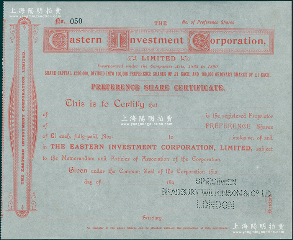 清代189x年(英商)东方投资有限公司红色第一版优先股样本,源于英国华德路印钞公司档案,从其票上档案编号推知,昔年近印制第1至50号共50张股票;英国藏家出品,据告根据档案显示:该公司曾在香港和上海开展业务,属外商金融企业;罕见且属首度公诸于阳明,九五成新