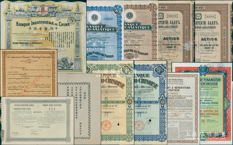 中国外商银行老股票共12种不同,详分:①华俄道胜银行1910年股权证书,1911年股票1股计187.50卢布,1912年股票1股计187.50卢布;②1920年代上海美丰银行信用证样张;③1920年中法实业银行股票500法郎;④1938年中法工商银行优先股1股计500法郎、普通股1股计500法郎;⑤1926年中国比利时金融公司1股计中国银元50元;⑥1928年(哈尔滨)法亚银行