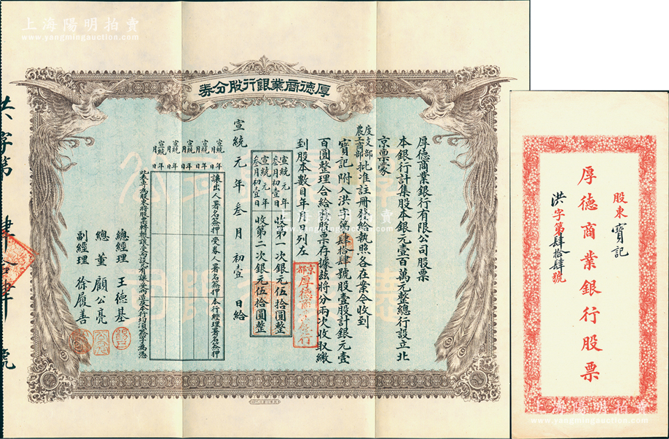 宣统元年(1909年)京都·厚德商业银行股分券,壹股计银元壹百圆,上印双凤图,附带原封套,乃属清代银行业老股票之罕见品,九成新