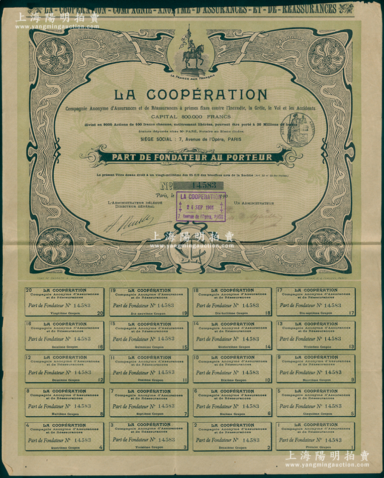清代1901年(法商)合作火灾保险公司股票,创始人优先股1股,上印骑士塑像图;海外藏家出品,少见,八成新