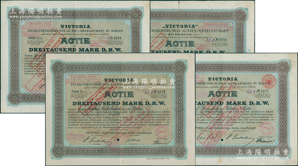 清末民初(德商)维多利亚火灾保险公司股票共4种不同,大型尺寸,面额均为3000马克,其发行年份分别为1904、1910、1914和1918年,该公司自清末以来便进入中国和香港等地拓展业务;海外藏家出品,八成新