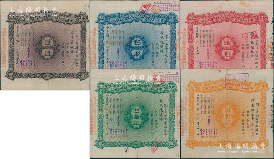 1915至1917年中国银行股份有限公司股票壹股、伍股、拾股、伍拾股、壹百股共5种全套,均由常务董事宋子文、宋汉章、叶琢堂、钱新之、王宝崘、冯耿光、陈光甫7人签名,其中50股股东为近代著名林学家和农学家凌道扬(现深圳有其故居纪念馆)、100股股东为晚清重臣赵尔巽幕僚陈莱青,八至八五成新