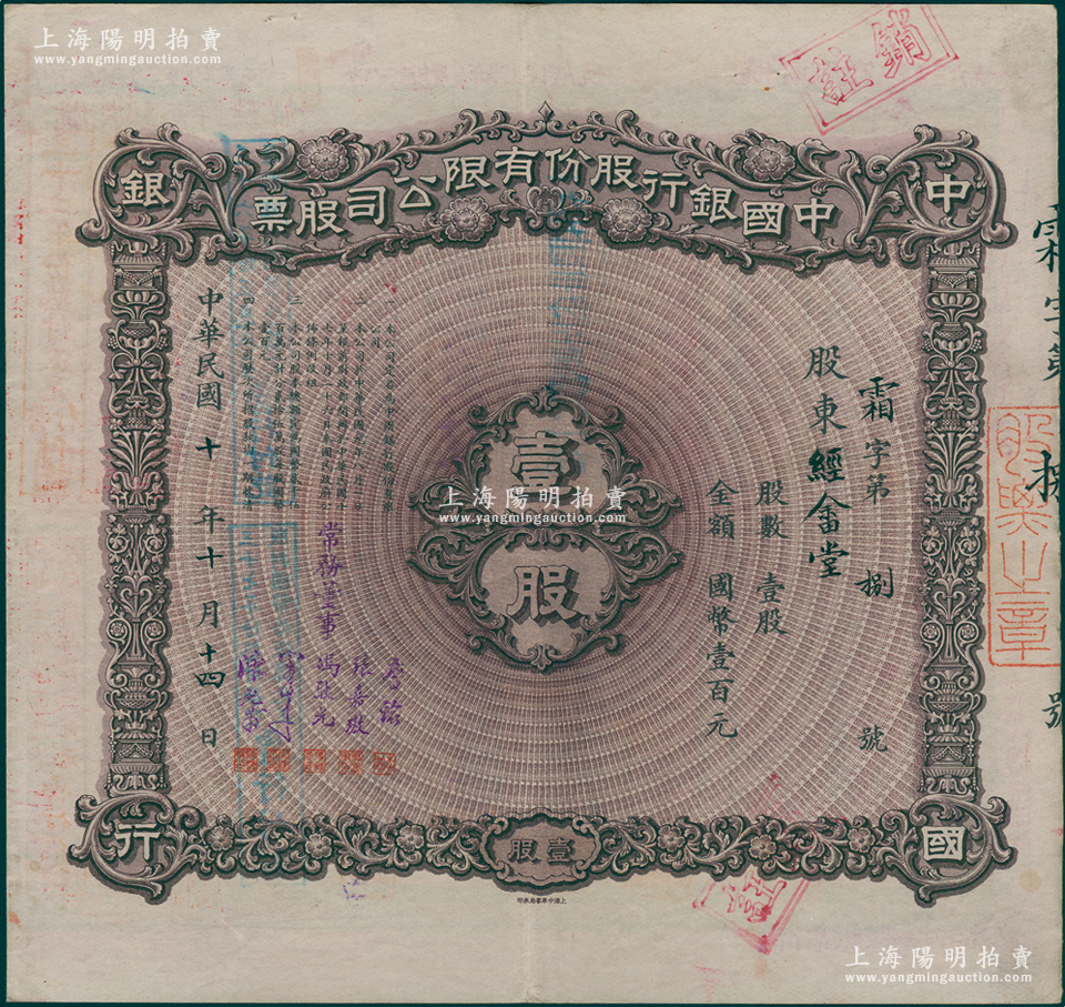 【名人股票】民国十年(1921年)中国银行股份有限公司股票,壹股计国币壹百元,发行号码仅为“霜字第8号”,票上股东经畲堂乃无锡荣氏家族之堂号,由常务董事李铭、张嘉璈、冯耿光、宋子文、陈光甫5人签名,背面兑付股息至1965年,上佳品相,八五成新