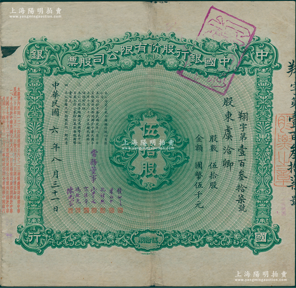 【名人股票】民国六年(1917年)中国银行股份有限公司股票,伍拾股计国币伍千元,其承购股东为近代工商业巨子虞洽卿,由常务董事钱新之、叶琢堂、孔祥熙、宋子文、宋汉章、冯耿光、陈光甫7人签名,背面兑付股息至1965年,罕见,八成新