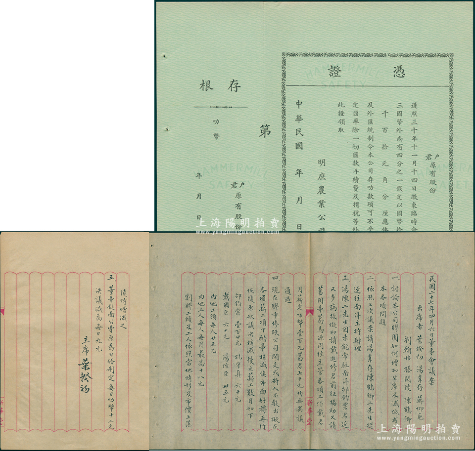 民国早期·明庶农业股份有限公司凭证,未填用附存根,该公司由浙江兴业银行所投资,在新加坡等地投资橡胶园;另附1938年4月6日“董事会议案”1份,出席者有叶揆初(即浙江兴业银行董事长叶景葵)、蒋抑卮(浙江兴业第一大股东)、刘翰怡(即“南浔四象”子弟、嘉业堂主人刘承干)等,且有主席叶揆初亲笔签名;八五成新